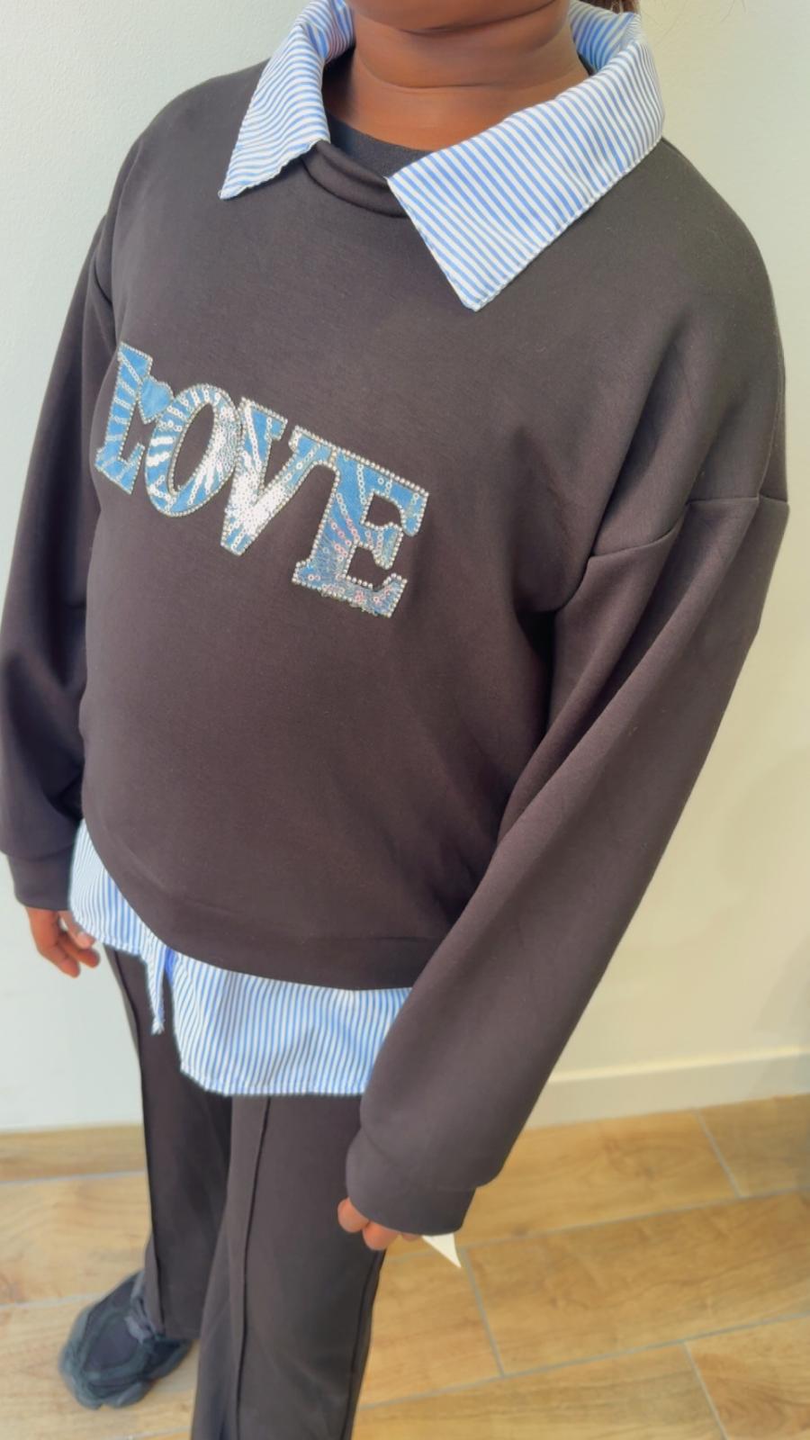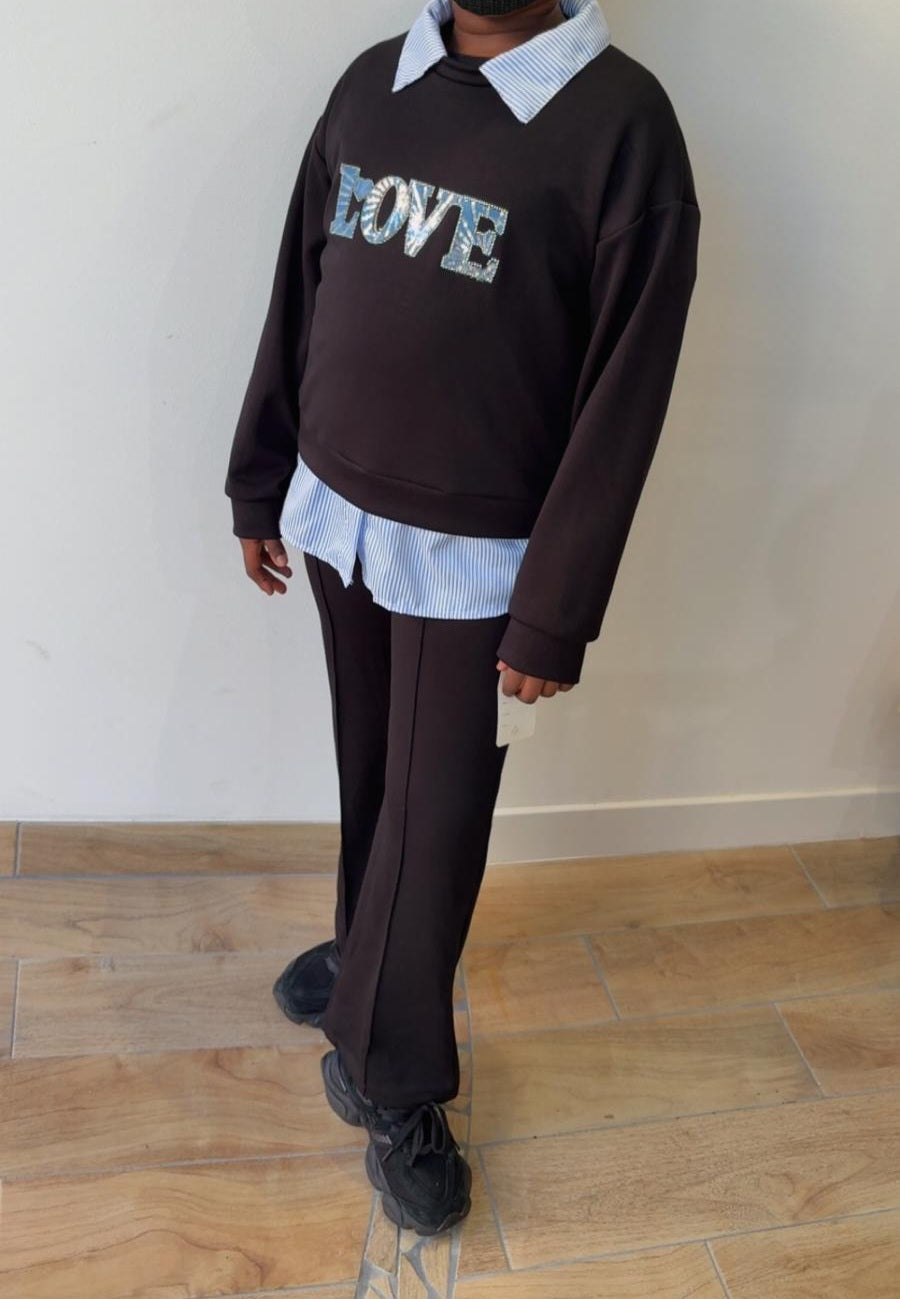 Ensemble avec pull à motif sequins et chemise intégrée et son pantalon élastique coupe large avec détail trait.