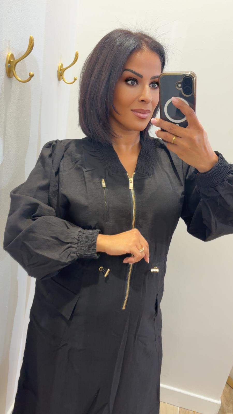 Robe fluide zippée devant, resserable à la taille avec cordons, poches et fentes sur les côtés.